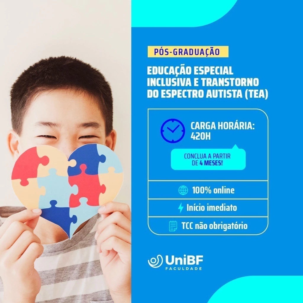 O curso de Pós-Graduação EAD em Educação Especial Inclusiva e Transtorno do Espectro Autista (TEA) da UniBF é proporciona ao profissional o aprofundamento nos conceitos de Educação Inclusiva, e Transtorno de Espectro Autista. Preparando o aluno para atuar com pessoas que precisam de acompanhamento especial, auxiliando no seu processo de desenvolvimento.
